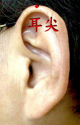 耳 尖 穴 位 在 耳 廓 最 上 端 , 摺 耳 可 取 , 是 「 回 甦 退 熱 降 壓 」 重 要 穴 位 ( 參 考 學 會 出 版 之 《 耳 針 治 病 新 法 》 七 穴 救 命 歌