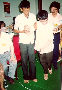 據 其 家 人 代 述 , 謂 青 年 三 十 歲 , 身 體 本 來 一 切 正 常 。 於 三 年 前 因 車 禍 引 致 腦 、 脊 受 傷 , 即 失 去 活 動 及 語 言 能 力 , 四 肢 隨 亦 變 形 , 表 情 怪 異 , 搖 頭 不 絕 。 徐 大 夫 乃 選 「 胃 」 為 主 穴 , 因 「 治 痿 必 用 陽 明 」 , 而 胃 即 足 陽 明 經 。 兼 輔 以 「 肝 」 、 「 腎 」 、 「 三 焦 」 、 「 腦 幹 」 , 「 鎖 骨 」 及 「 坐 骨 神 經 」 等 穴 , 請 其 父 固 定 病 人 頭 部 , 勿 使 擺 動 , 先 以 激 光 照 射 , 並 貼 壓 丸 , 再 加 頸 椎 及 全 脊 調 整 。 至 三 診 時 , 病 人 已 不 需 扶 頭 , 可 任 由 醫 者 照 耳 , 治 療 完 畢 , 竟 可 蹣 跚 舉 步 , 自 行 離 去 , 觀 者 不 禁 鼓 掌 稱 奇 。 第 四 天 因 椰 城 大 雨 水 浸 , 交 通 混 亂 , 故 未 來 就 診 。 至 四 診 後 , 醫 者 著 其 父 詢 問 病 人 是 否 感 覺 有 痰 阻 塞 喉 部 , 故 欲